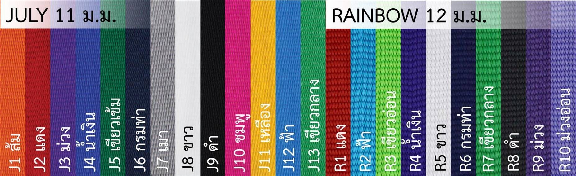 แถบสีสายคล้องมีให้ลือกตั้งแต่ 10 มม.รุ่น วิน WIN 11มม. สายรุ่น JULY 12มม. สายรุ่น RAINBOW 13มม. สายรุ่น LOGO 15มม. สายรุ่น FIFTEEN 19มม. สายรุ่น NINETEEN เป็นแบบขนาดเหมาะสม ผลิตจากสายโพลีเอสเตอร์คุณภาพดี สวยงาม เหมาะสำหรับนำมาสกรีนสาย ด้วยข้อความและโลโก้ สกรีนข้อความได้ 1-2 สี